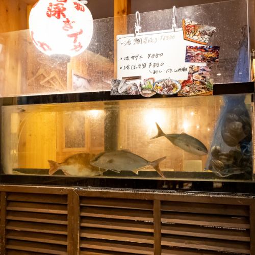 獲れたての活き活きとした鯛・サザエ・ほっき貝の大きな水槽も魅力。注文が入ってからあげて丁寧に調理するので新鮮なものをお召し上がりください♪